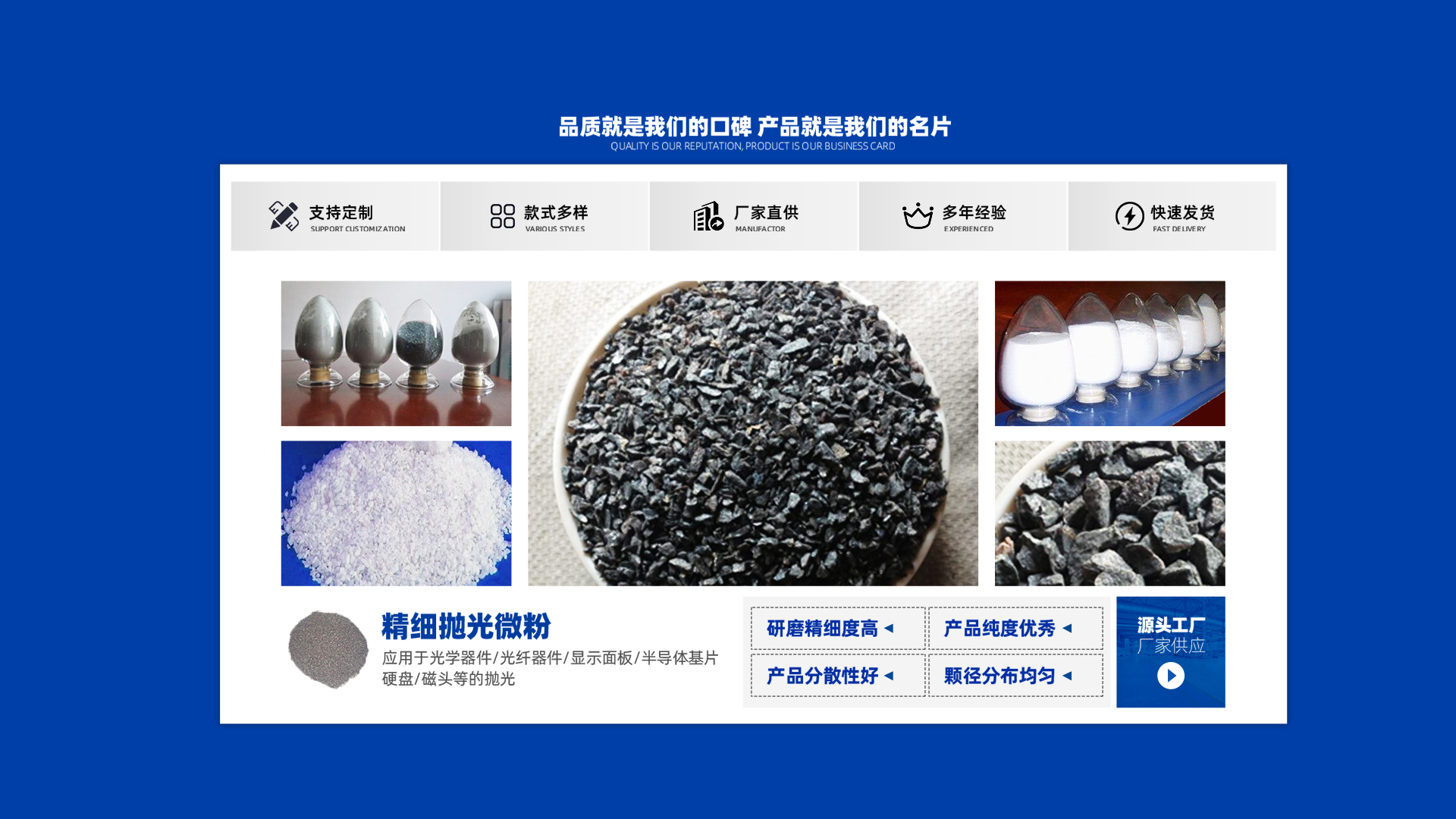 18年來(lái),雙岳磨料經(jīng)過(guò)不斷發(fā)展和技術(shù)的積累,凝聚了 一批經(jīng)驗(yàn)豐富,素質(zhì)精良的專(zhuān)業(yè)人才。我們始終堅(jiān)持“客 戶(hù)為本”原則發(fā)展,以誠(chéng)信經(jīng)營(yíng)為基礎(chǔ),以服務(wù)滿(mǎn)意為保 證,歡迎新老客戶(hù)來(lái)廠洽談業(yè)務(wù)。